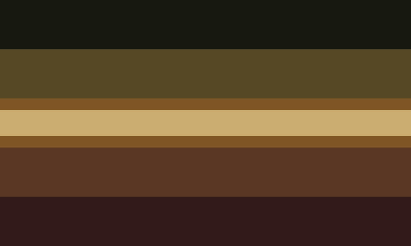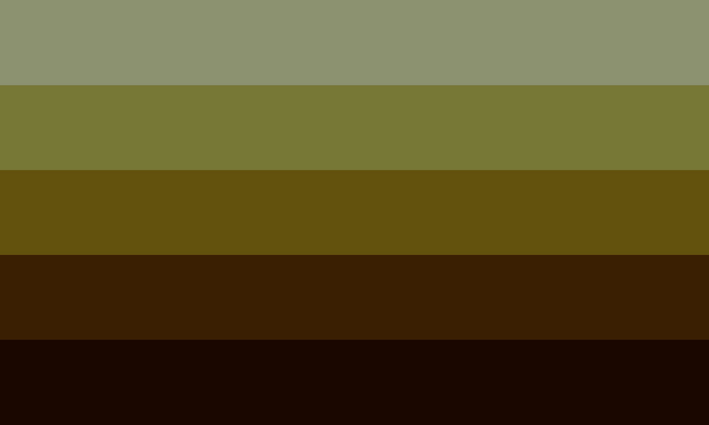 The dark green represents dirtied articles of clothing.The muted light green represents dirt as a tool for disheveling the desired object.The two mustard yellow stripes represent messiness.The light yellow represents the attractiveness of dirtied objects.The light brown represents the start of disheveling.The dark brown represents the senses being hit with foulness.
