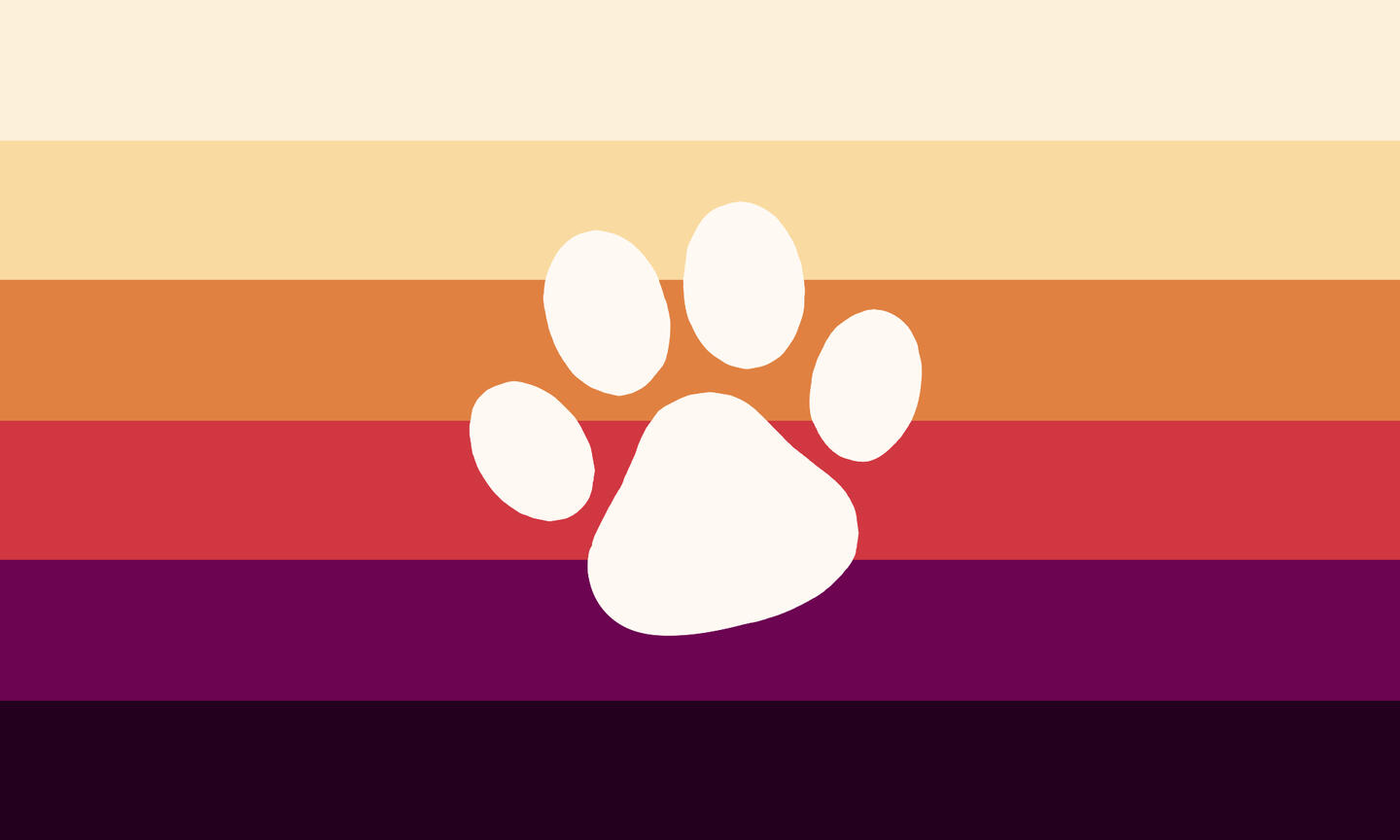 The top light beige represents the perking of fictitious canines' ears.The tan stripe represents the energetic thumping of fictitious canines' tails.The orange stripe represents the sound of padded, clawed feet coming close.The dark red-ish orange stripe represents a resounding bark.The warm purple stripe represents the snarl pulling at fictitious canines' lips.The dark purple stripe represents the growl resonating in fictitious canines' throats.
